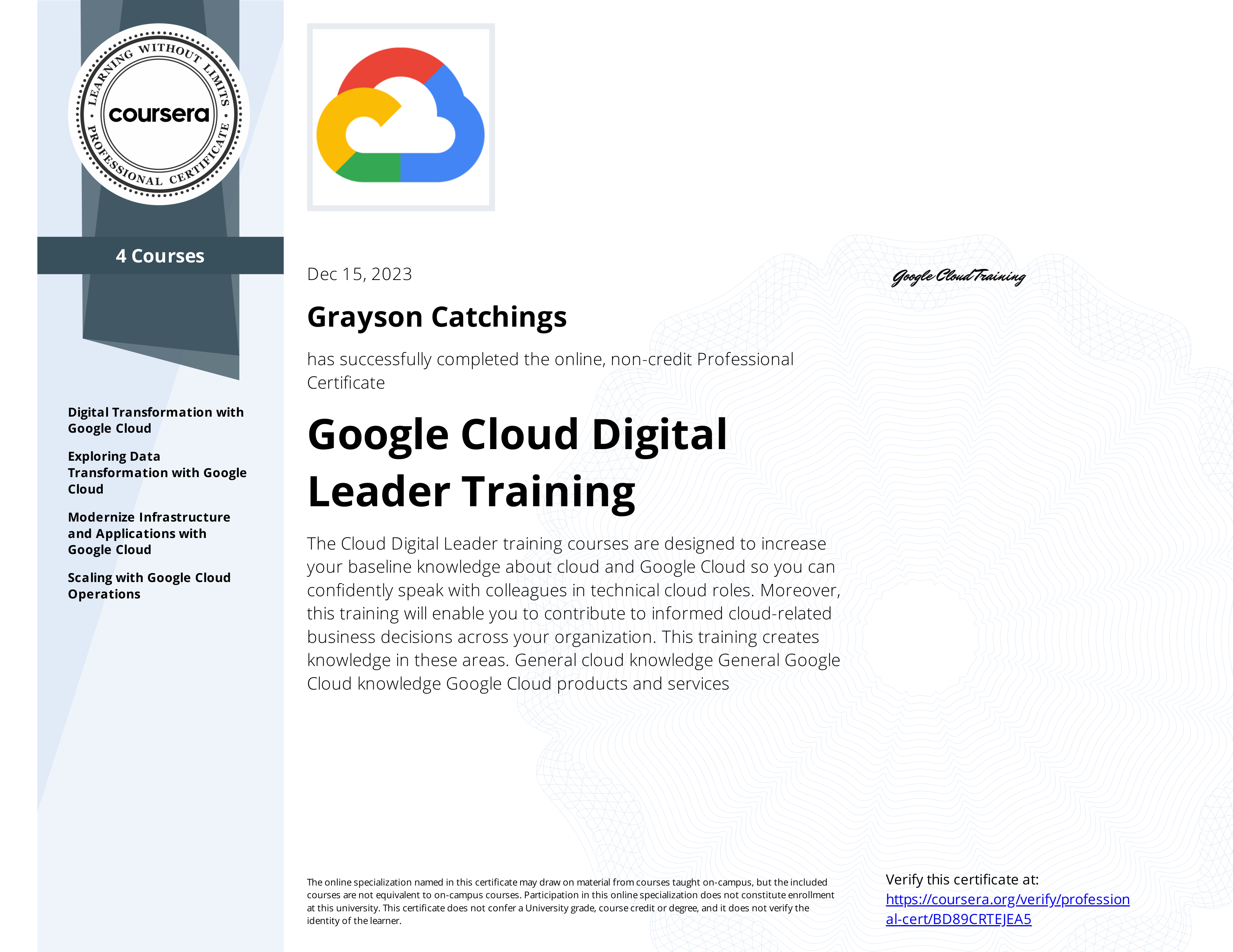 Verified credentials and certificates I recived from Google in various technological fields. I plan to pursue additional credentials to further expand my expertise and Knowledge.
